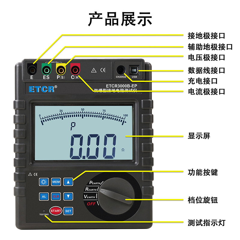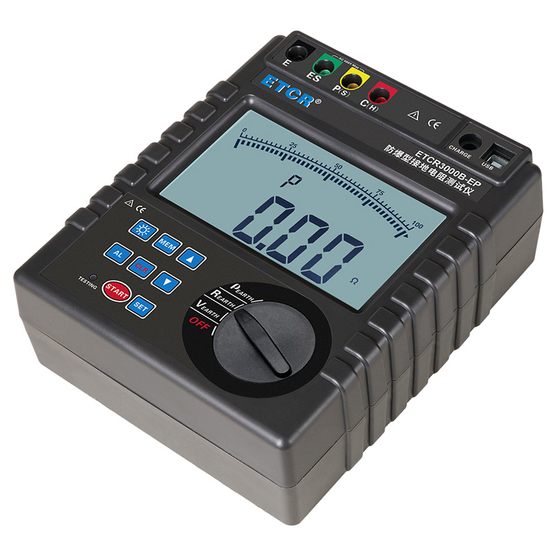 ETCR3000B防爆型接地電阻測試儀又稱數字接地電阻測試儀、地樁式接地電阻儀、土壤電阻率測試儀、二三四線接地電阻測試儀,用于接地電阻、土壤電阻率、接地電壓測量,采用數字及微處理技術,精密4線法、3線法和簡易2線法測量接地電阻,導入FFT(快速傅立葉變換)技術、AFC(自動頻率控制)技術,自動識別干擾并選擇測量頻率,使干擾的影響最小化,提供更加準確的接地電阻值,廣泛應用于電力、電信、氣象、建筑、防雷及工業電氣設備等行業。