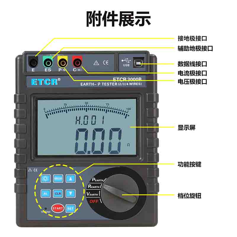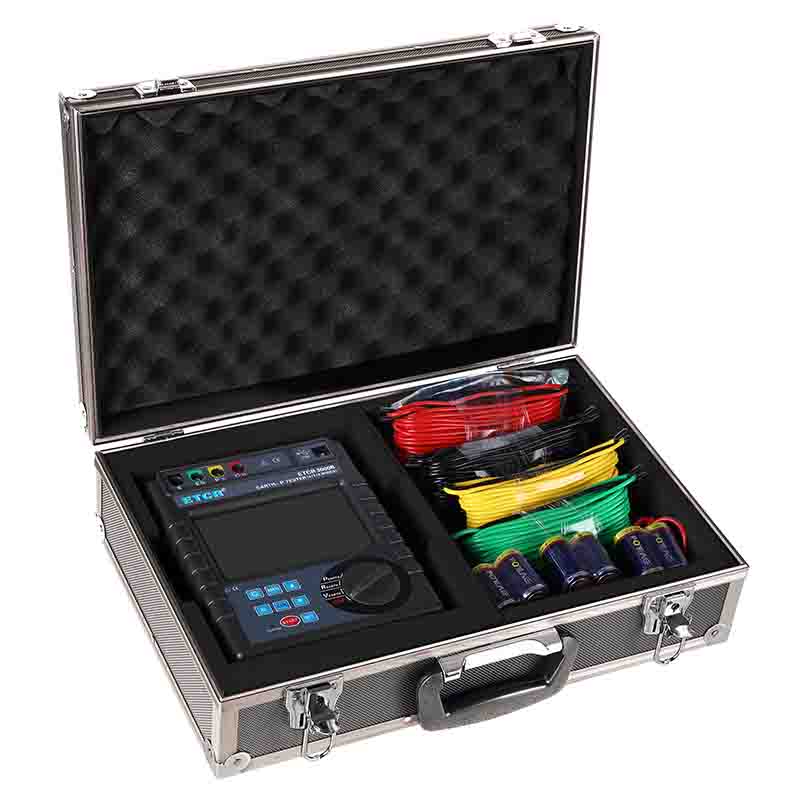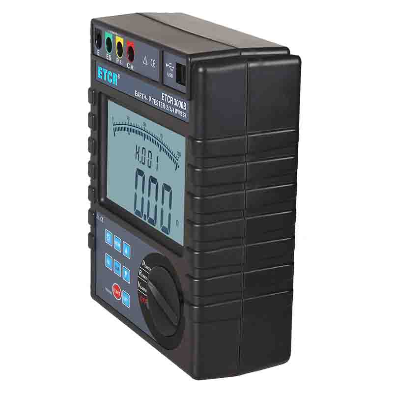ETCR3000B接地電阻/土壤電阻率測試儀由主機、數據上傳軟件、測試線、輔助接地棒、通訊線等組成。主機超大LCD顯示,白屏背光,棒圖指示,一目了然。存儲功能,存儲300組數據,通過USB接口數據上傳軟件實現歷史查詢與在線實時監測功能,動態顯示,告警指示,具有歷史數據讀取、查閱、保存、報表、打印等功能。