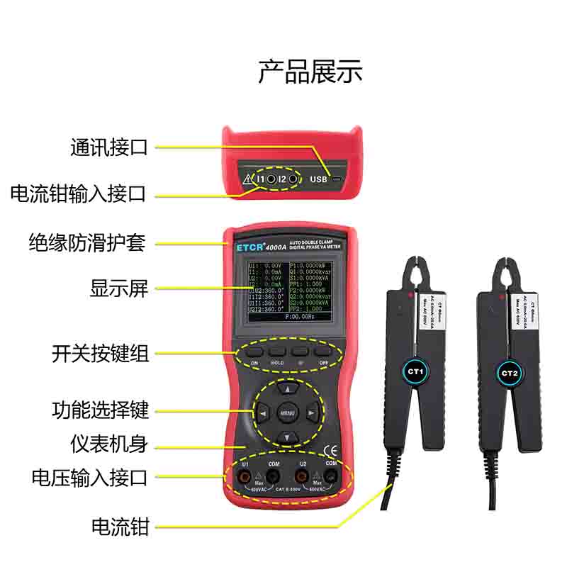 ETCR4000數(shù)字雙鉗相位伏安表Φ8mm0~360°0.00V~600V0.00A~20.0A--