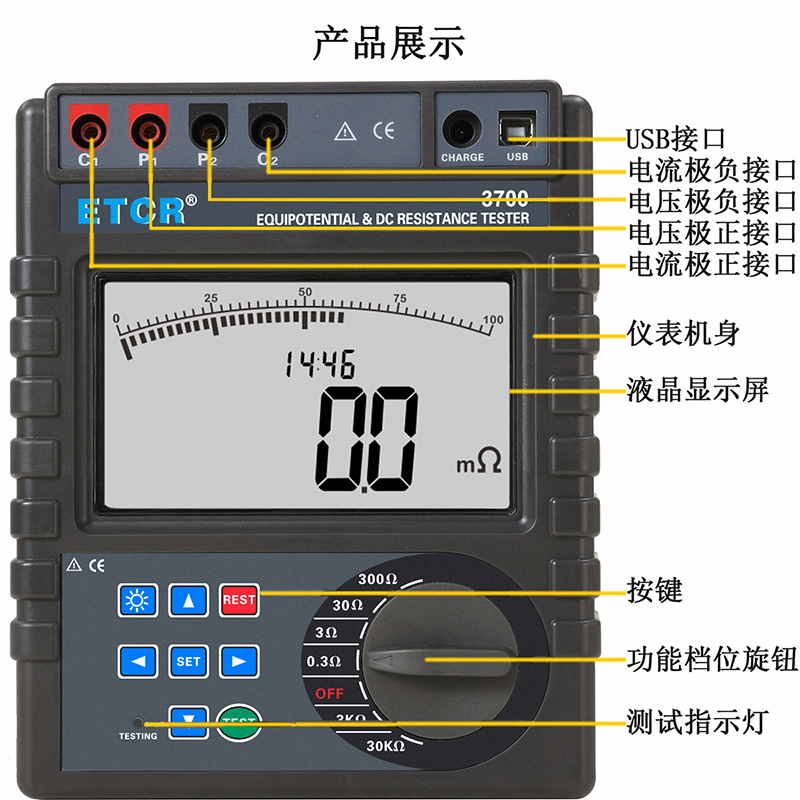 ETCR3700A便攜式等電位聯結電阻測試儀0.001mΩ~40.0kΩ4mΩ、40mΩ、400mΩ、4Ω、40Ω、400Ω、4kΩ、400kΩ1.2A MAX——9999組藍牙、USB