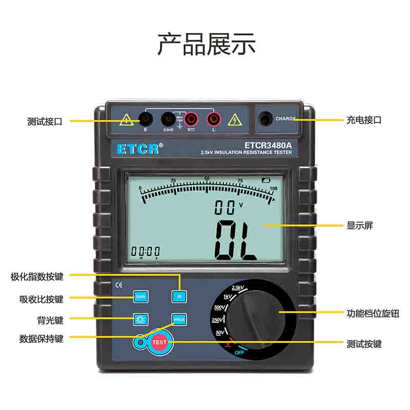 ETCR3480B絕緣電阻表50V、250V、500V、1000V、2500V、5000V0.1MΩ~1000GΩ2mA MAXAC/DC:0V~750V