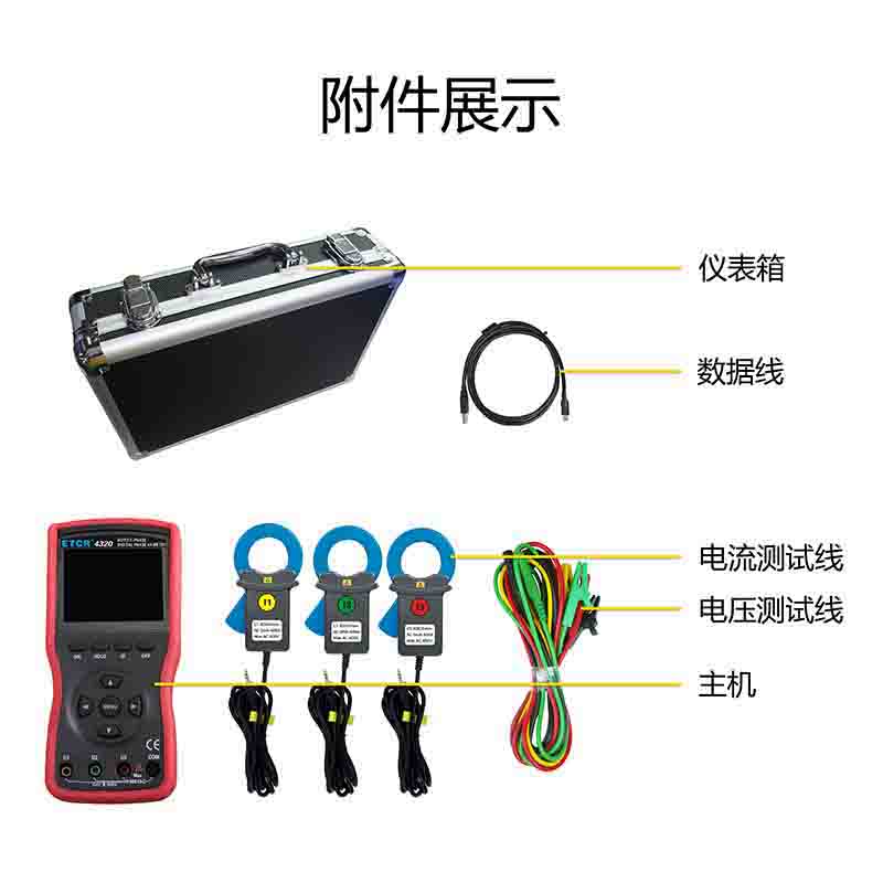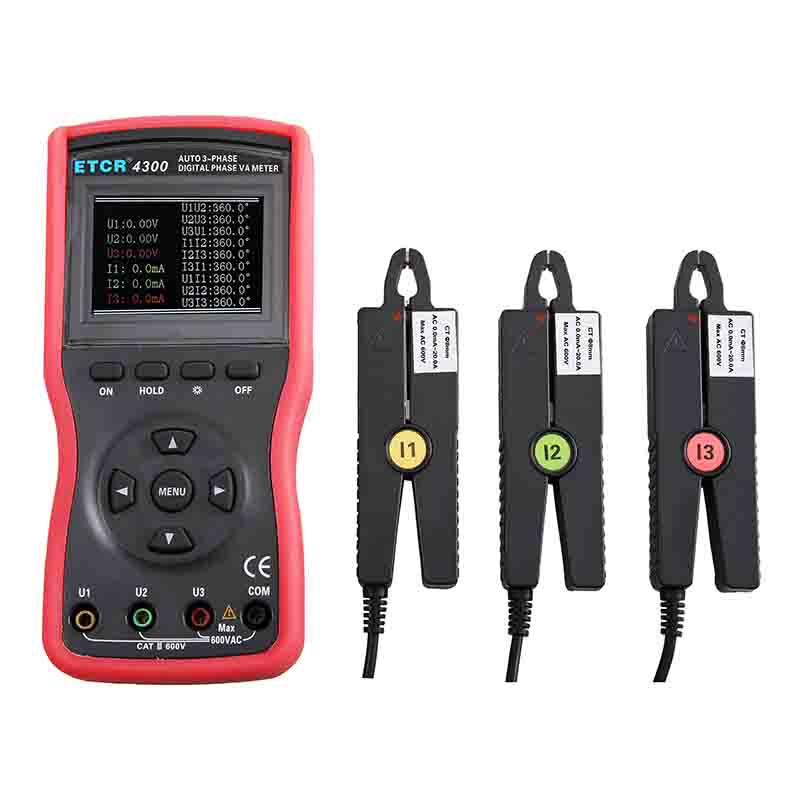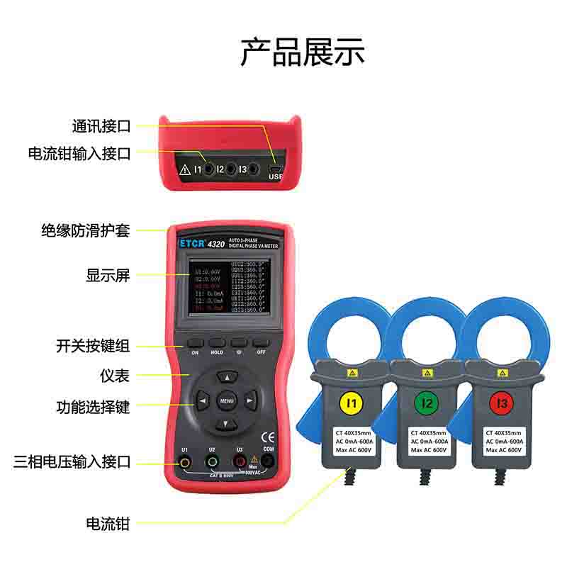 ETCR4320大口徑三相數字相位伏安表又稱三鉗相位伏安表、三相相位伏安測試儀、手持式相位測試儀、便攜式相位表 、矢量圖分析儀,用于同時測量三相交流電壓、電流、電壓間相位、電流間相位、電壓電流間相位、頻率、相序、有功功率、無功功率、視在功率、功率因數、電流矢量和,判別變壓器接線組別、感性、容性電路,測試二次回路和母差保護系統,讀出差動保護各組CT之間的相位關系,檢查電度表的接線正確與否,檢修線路設備等,為用電檢查人員提供一種安全、準確、便捷的新型電力儀表。尤其適用于電能計費系統及繼電保護系統。