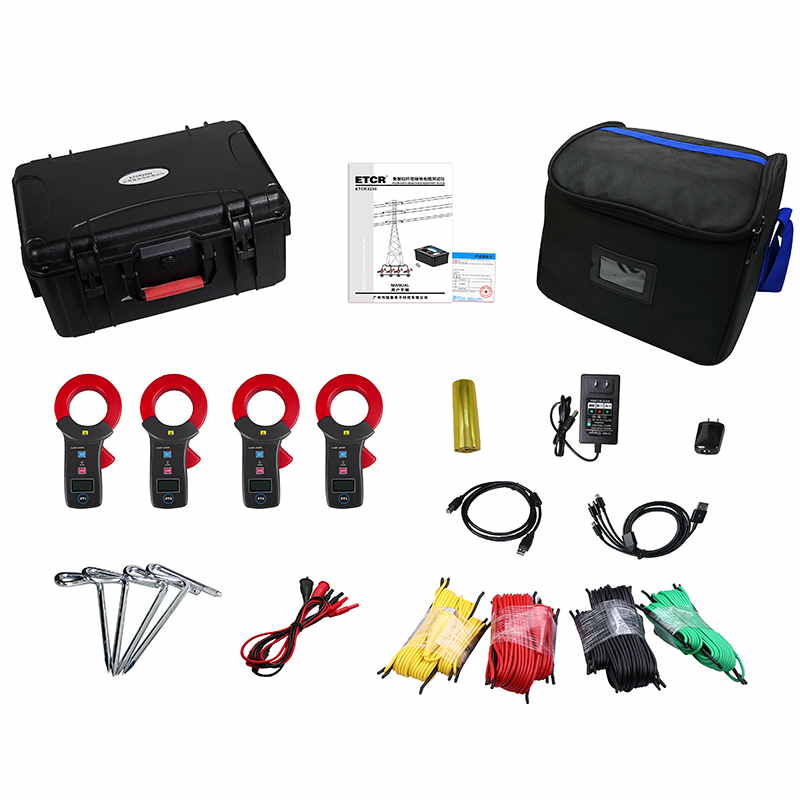 ETCR3250免解扣桿塔接地電阻測試儀由主機、4個電流鉗、測試線、輔助接地棒、通訊線、打印機等組成。主機采用7寸彩屏,電流鉗與主機采用無線通訊,儀表還具有藍牙通訊,下載APP后可在手機進行測試及查看測試結果。儀表配有內置式打印機,可在現場打印測試結果。儀表能存儲100組數據,通過USB接口及上位機軟件上傳測試結果,實現歷史數據讀取、查閱、保存、報表、打印等功能。儀表外殼采用防水保護箱,防撞、防摔、防水(防護等級IP65)堅固安全耐用,儀表還配有大容量可充電鋰電池組,特別適合在戶外工地使用。