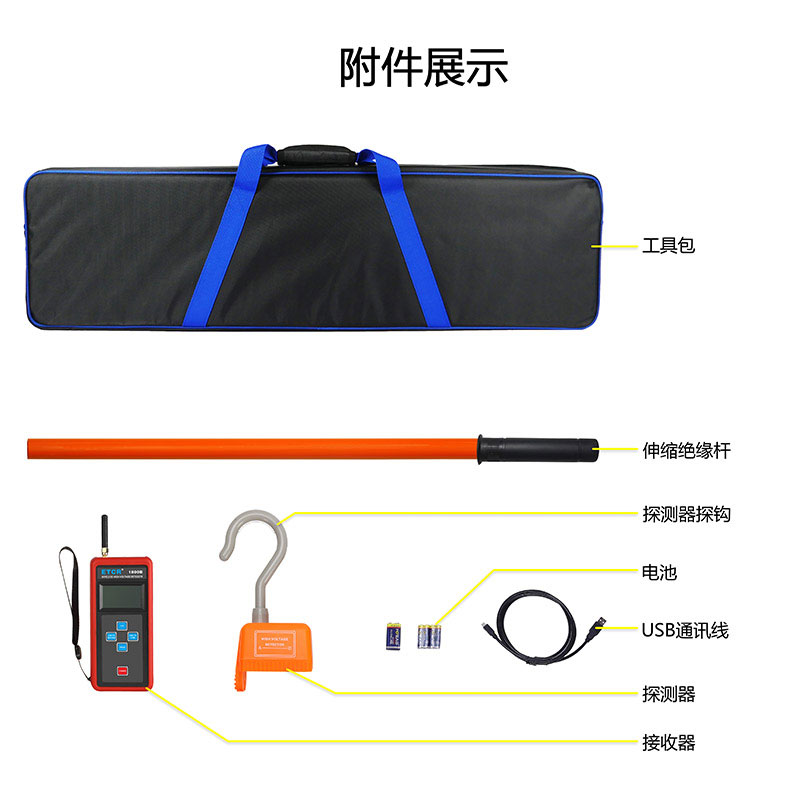 ETCR1800B無線高壓驗電器由接收器、探測器、伸縮絕緣桿、數據上傳軟件、USB通訊線等組成,測試時只需用絕緣桿把探測器掛在裸導線上,通過無線信號傳輸即可在手持接收器上讀取電壓值及電流值,一目了然非常直觀,操作非常方便。無線信號直線傳輸距離約30米,探測器有紅色LED和蜂鳴器等聲光報警,使測試更簡單輕松。通過USB通訊接口和上位機軟件存儲數據上傳電腦具有歷史數據查詢、保存、打印等功能。